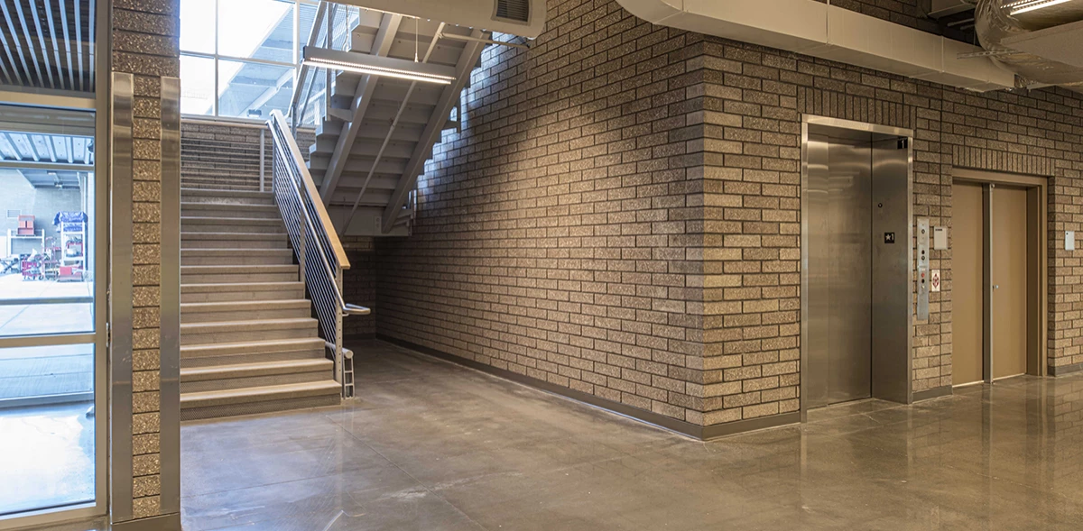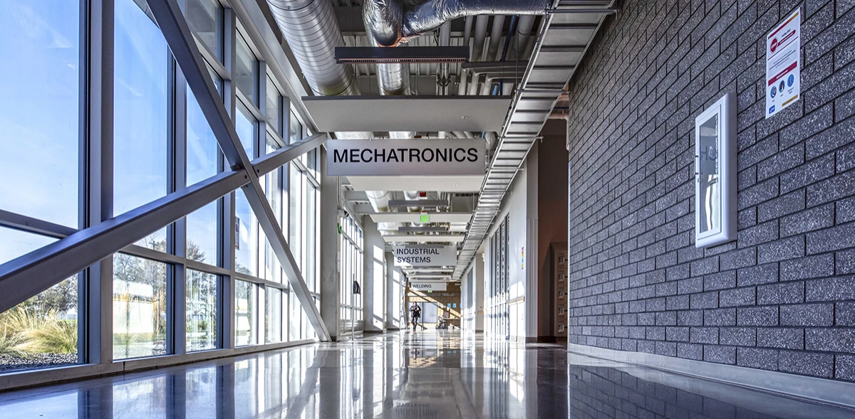 The South and Central portions of the facility are three stories; the first and second floors are occupied by classrooms and labs for electronics, mechatronics and other training spaces, while the third story is a mechanical penthouse. The Northwest and Northeast portions are single story high bay technical laboratories, including 2 large automotive mechanics and technology centers and a welding shop.
