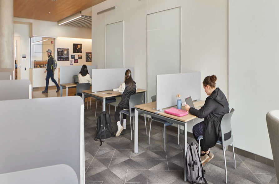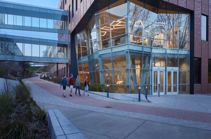 This facility boasts over 100,000 SF of laboratory classrooms, conference rooms, and study pods and includes two covered pedestrian walkways that connect the facility to the existing Science Building. The fourth level also provides an outdoor common area with cafe tables surrounding the glass-walled conference room. The two main entrances draw attention with angled glass and walls that highlight the large slanted concrete columns.
