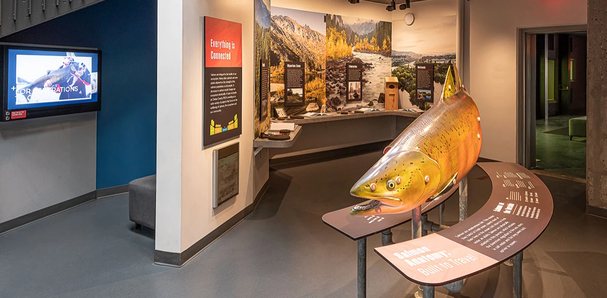 Project exhibits include a tribute to the first people of the Columbia river, large-scale models of salmon, the history of the hydroelectric power on the Columbia river and educational exhibits on detailed workings of the dam.