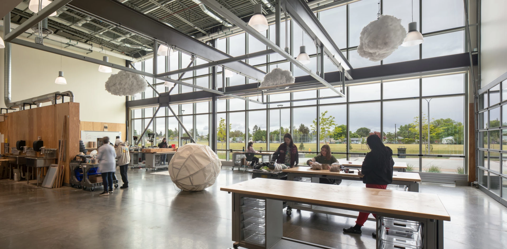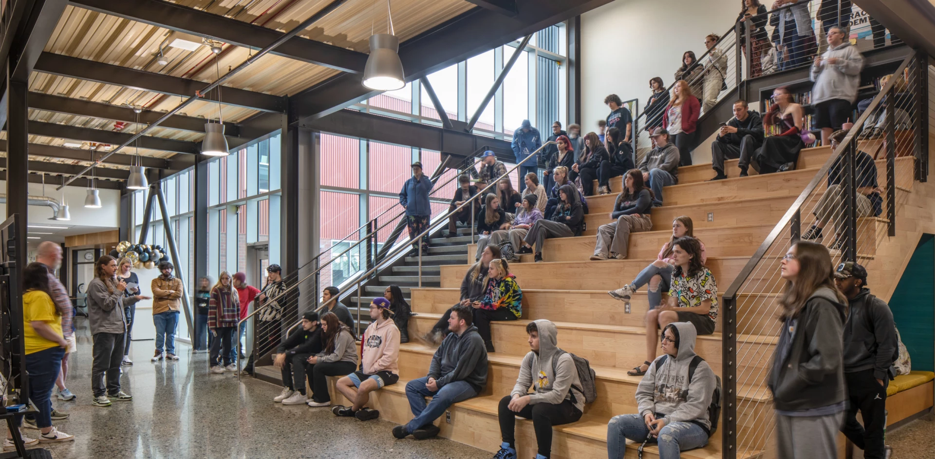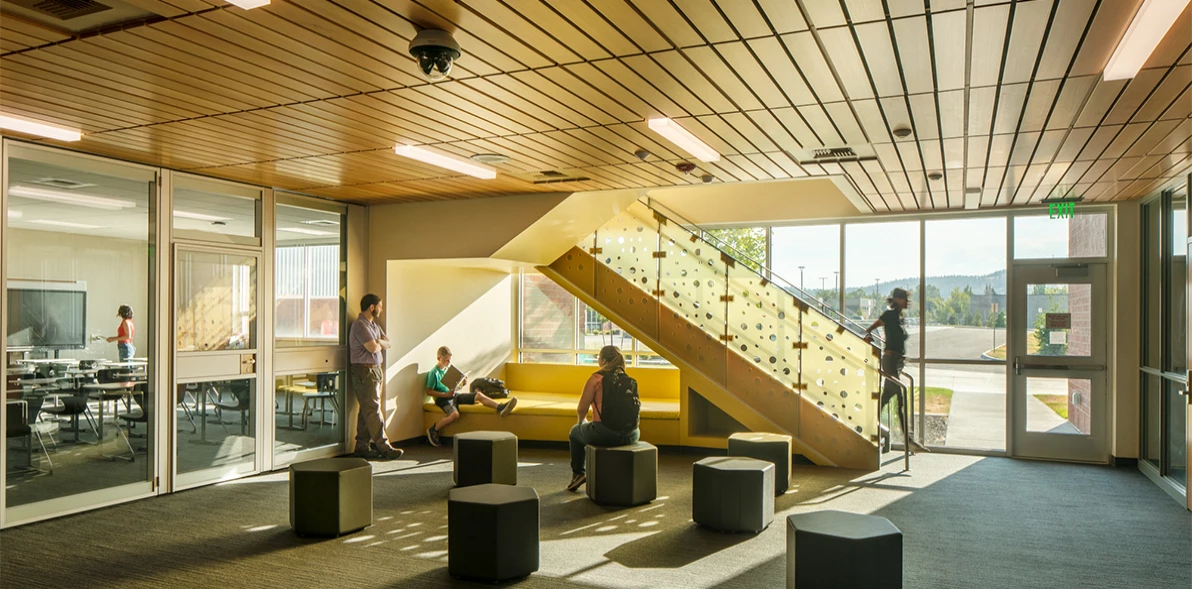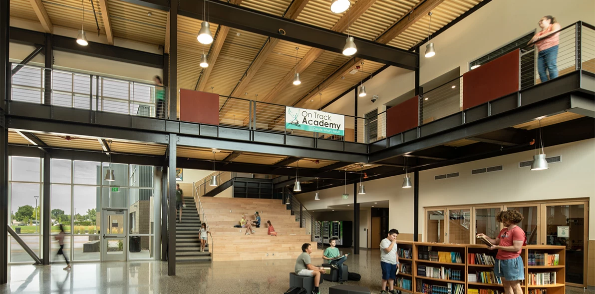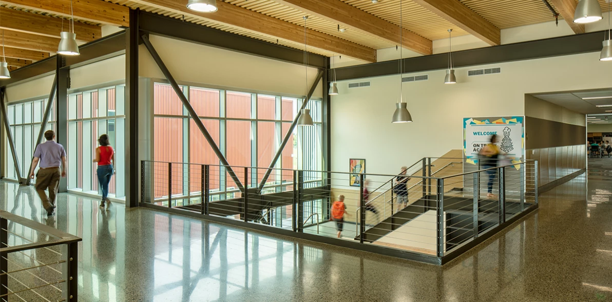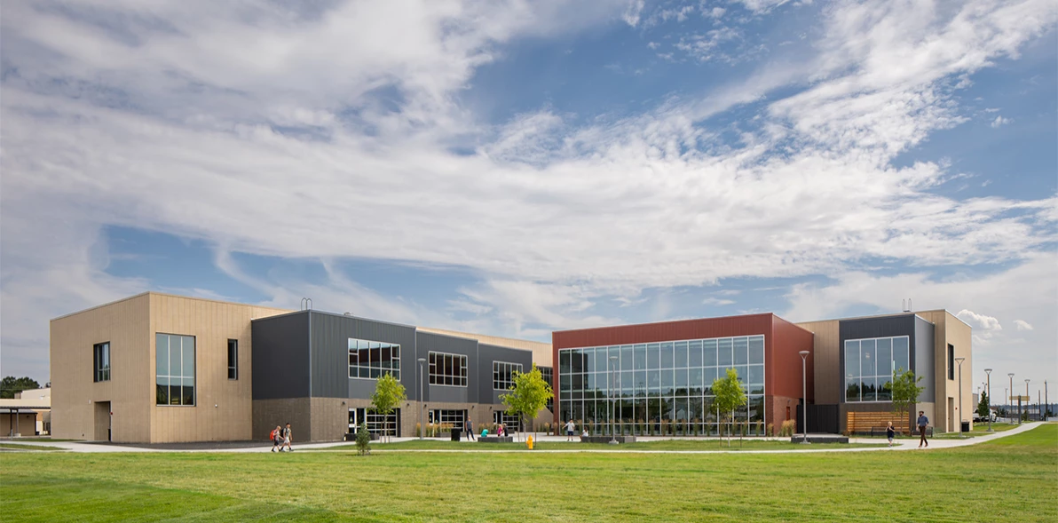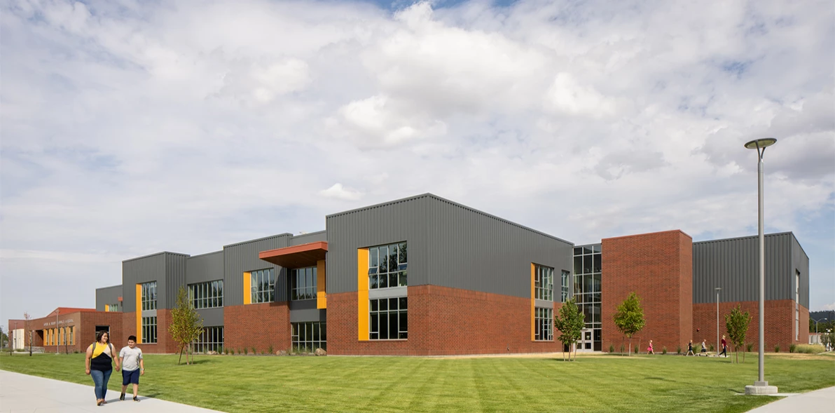 The project also includes the Cook Street enhancement, which provides connectivity and traffic calming for the school, library, STA and community center directly across the street. It also provided a tie-in to the Children of the Sun Trail and includes concrete plazas, playground equipment and landscaping enhancements to provide an open campus from the community center all the way through to the NewTech Skills Center. The Shaw Middle School portion is a 155,000 SF building with 41 classrooms, kitchen, administration offices, gymnasium and the Hillyard branch of the Spokane Public Library. The On Track Academy is a 51,000 SF building with 13 classrooms and shop spaces, creative suites for arts and earth science, STEM labs, a commons, administration offices and a community outreach center.