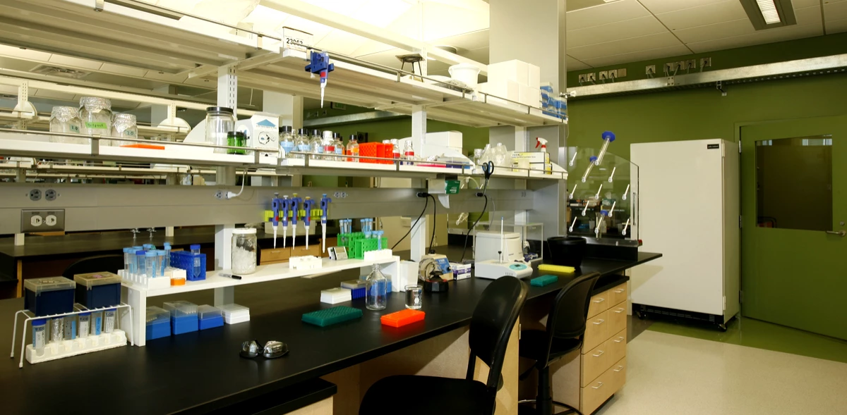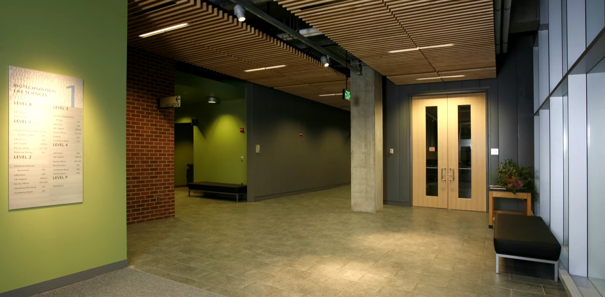 The five-level cast-in-place structure, plus a penthouse, houses research laboratories, core labs, lab support spaces, a vivarium, conference rooms and office space was a GC/CM project. Specialized systems include de-ionized water, laboratory air, laboratory vacuum, localized gas, emergency eyewash and showers, security access control and specialized lighting controls.