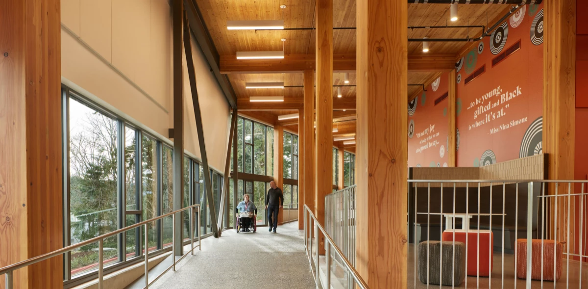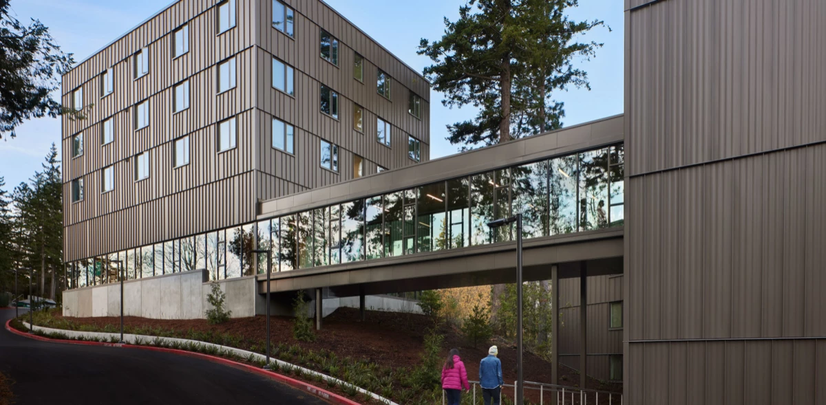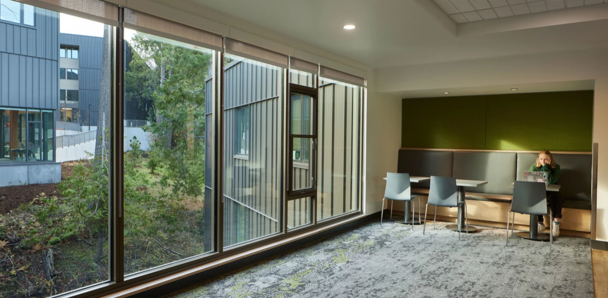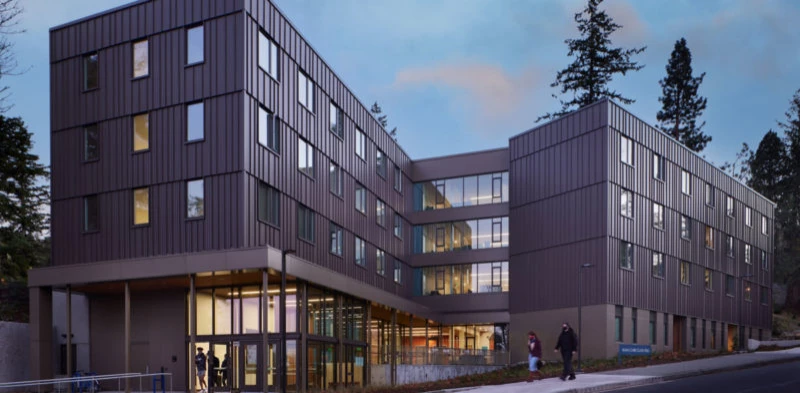 The 400-bed Alma Clark Glass Hall offers a range of living and community spaces, including bedroom suites, shared common areas, study spaces, community kitchens, and a laundry facility. It also houses essential support areas such as staff offices, storage, bike storage, and custodial space. As Western’s first design-build project, the hall achieved LEED Gold certification and honors Alma Clark Glass, the university’s first Black student.
